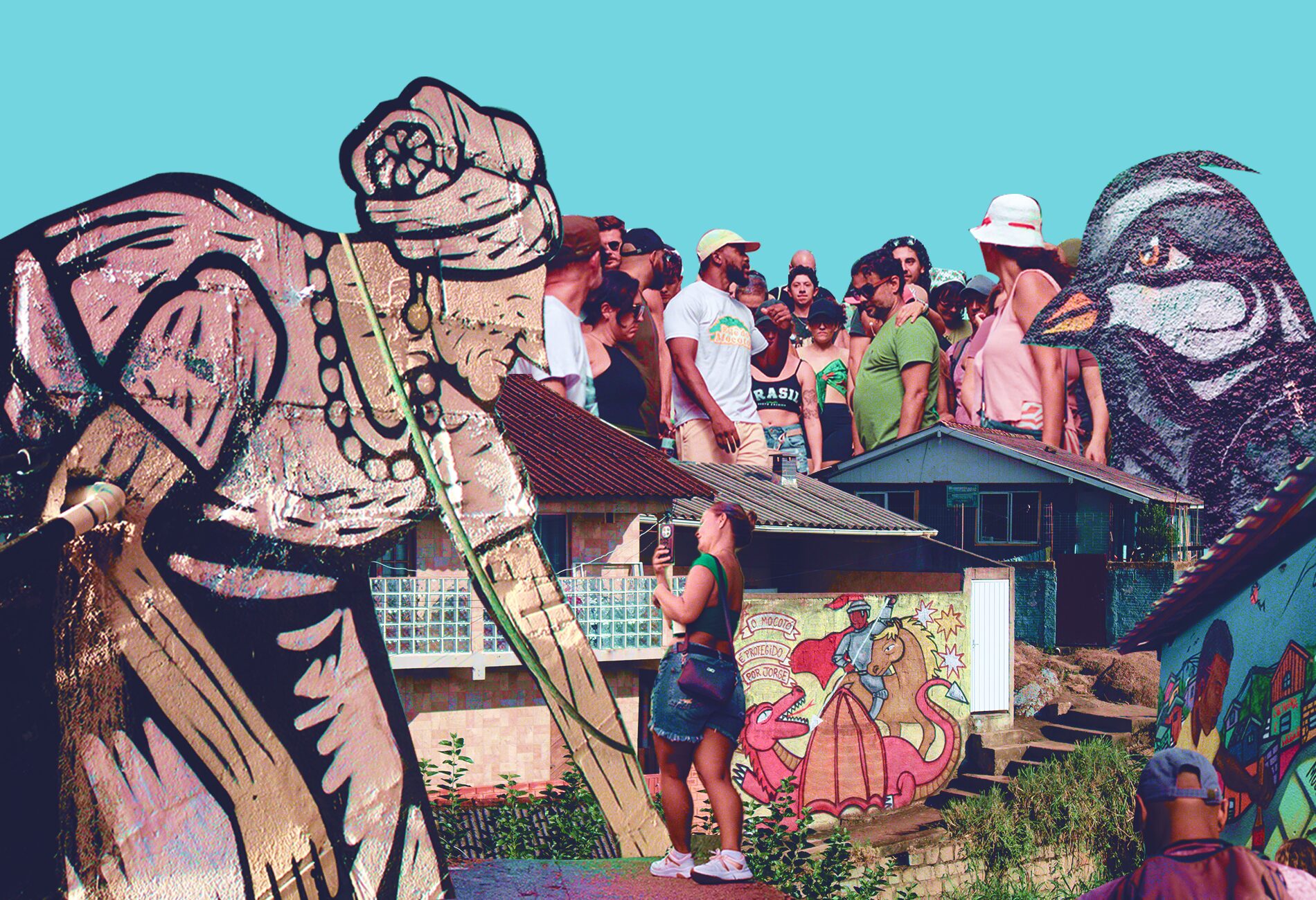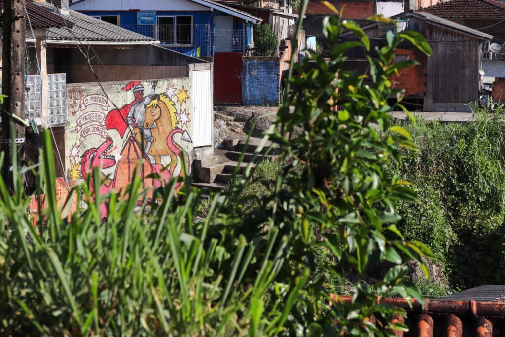 Iemanjá, Preto Velho e Oxalá também já foram representados nos becos do Mocotó. São Jorge é celebridade por ali, com pelo menos quatro murais espalhados pela comunidade. Isso porque, em algumas vertentes da Umbanda, o Santo Guerreiro é sincretizado ao orixá Ogum. Não à toa, os Jorges do Moca têm pele preta.