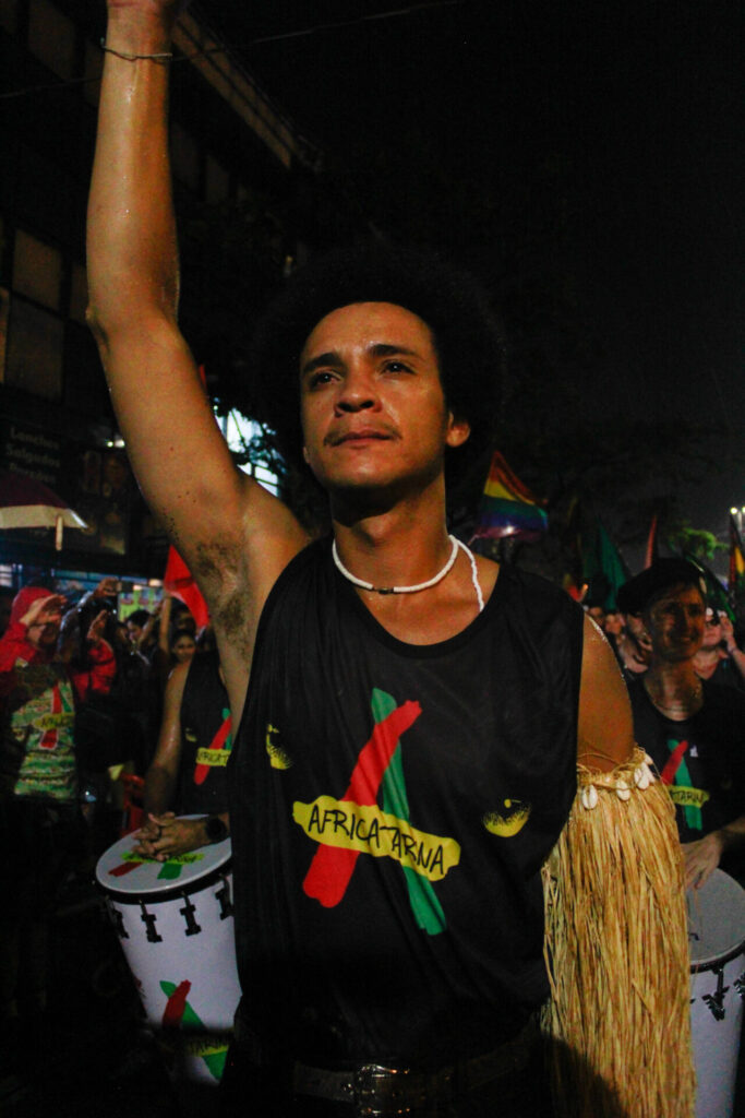 “Quando a gente saiu pela primeira vez na rua, foi mágico. Mas, ao mesmo tempo, a gente sentiu todo esse efeito de criminalização. Enquanto Blocos Afros, a gente tem que pensar se nossas crianças não vão levar spray de pimenta, se o nosso bloco não vai ser atropelado por um trio elétrico, que foi sobreposto no mesmo trajeto que o nosso, mesmo a gente pagando licença. A gente tem que pensar se não vai ter uma cavalaria que vai entrar no meio do nosso bloco e pode machucar nossos integrantes”