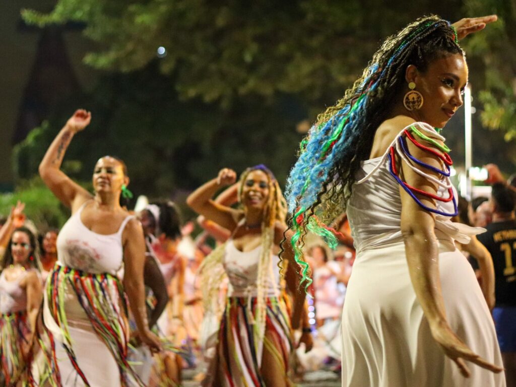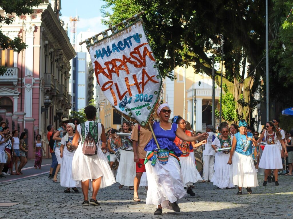 Africatarina, Baque Mulher Floripa, Bloco Cores de Aidê e Maracatu Arrasta Ilha: a tradicional Volta à Praça dos Blocos Afros Floripa é mais do que um simples desfile. É intervenção artística, política e social. Te faz cantar, dançar e sentir junto. É estética transformada em discurso. É grito de resistência em meio a um cotidiano de apagamento. É a negritude transformando a cidade em palco.